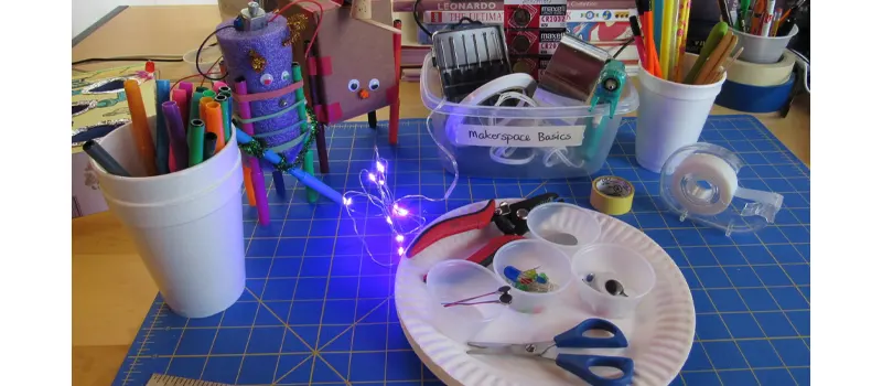 Start with a basic workspace, simple storage, and open-ended materials such as cardboard, paper tubes, tape, fabric scraps, bottle caps, and other clean recycled items. Many effective makerspaces grow gradually over time, with new tools and materials added only after teachers see how children are actually using the space.