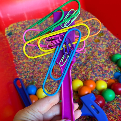Fill a tray with dry rice and hide small metal and plastic objects inside. Give kids a magnet wand and let them go “fishing.” They love discovering what sticks and what doesn’t, and they’ll start sorting, testing, and comparing without even realizing they’re doing science.