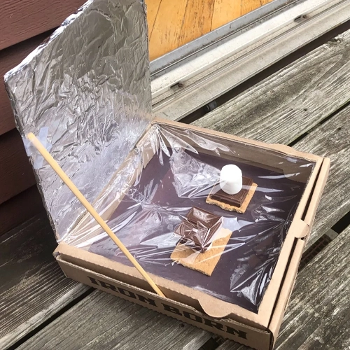 Children build a simple solar oven using a pizza box lined with foil and covered in plastic wrap. The interior is painted black or lined with dark paper to absorb heat. After placing marshmallows or chocolate inside, the box is positioned in direct sunlight. Over time, the contents soften or melt, showing how the sun’s energy can be captured and used. This activity introduces solar energy, heat absorption, and basic engineering design in a hands-on way. It’s one of the most engaging STEAM activities for kids when exploring renewable energy.
