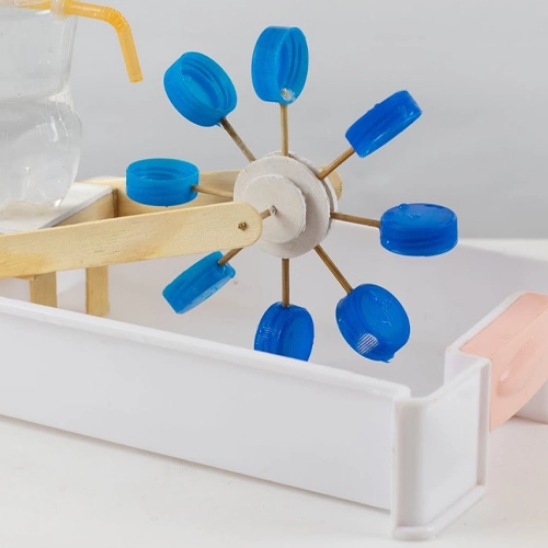 Children design and build a simple water wheel using recycled bottle caps attached to a central stick or skewer. The wheel is placed over a bowl or container, and water is poured over it to make it spin. Variations in cap size, spacing, and water flow can be explored to change rotation speed. This activity helps children understand mechanical energy, water flow, and basic engineering principles using recycled materials.