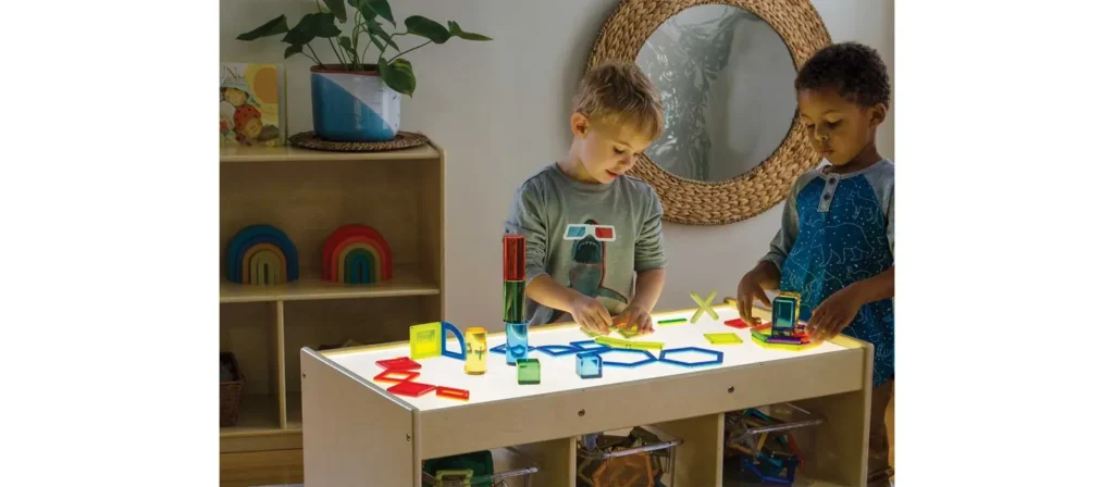 Role-play works best when supported by dramatic play furniture, pretend kitchen sets, dress-up storage units, and open shelving that keeps props visible but unordered. Too much categorization limits movement. Too little access creates crowding.