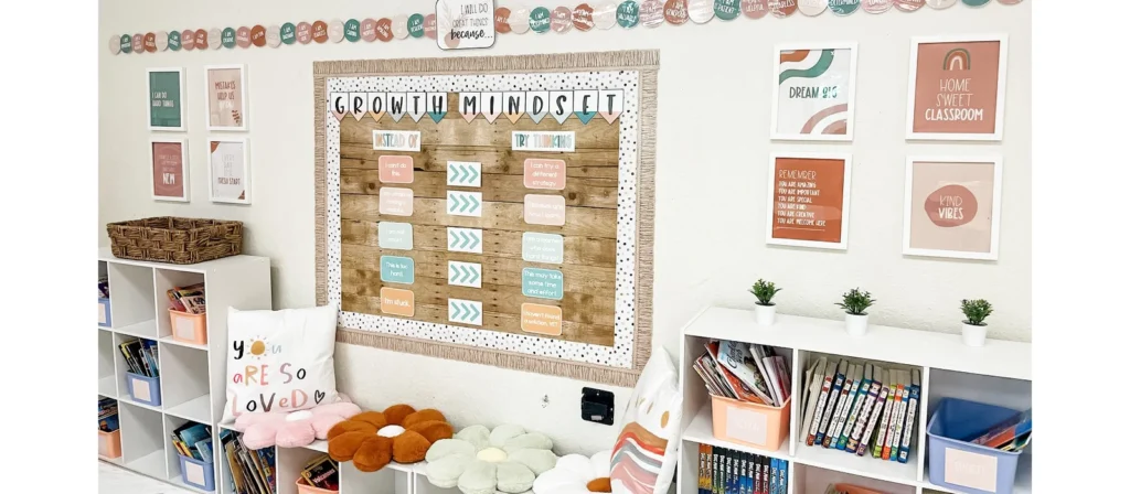Begin with a simple color palette and stay consistent. Limit wall displays to materials that support your current lessons or classroom routines. Instead of covering every surface, leave intentional blank space to give the eye room to rest. One thoughtfully designed bulletin board with rotating content often makes more impact than a wall filled with competing visuals.