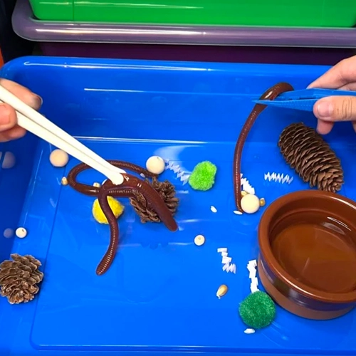 Materials: tweezers, spoons, clothespins, chopsticks, small food items (beans, pasta, seeds), bowls