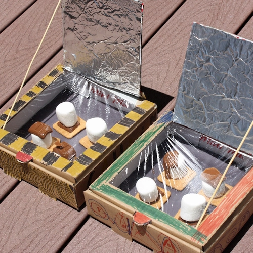 Materials: pizza box, aluminum foil, black paper, plastic wrap, tape, marshmallows, graham crackers, chocolate