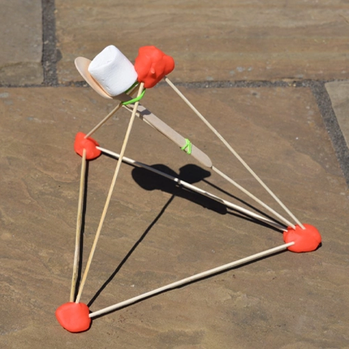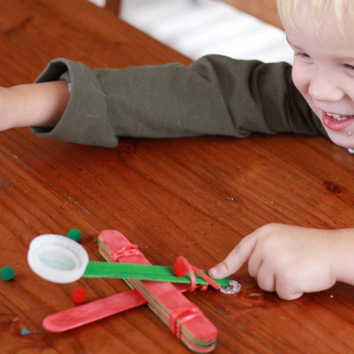 Kids build a handheld catapult using simple materials. Secure the spoon with rubber bands between stacked sticks, then launch pom-poms and measure the distance. They can adjust the design to change force and angle—great for learning about tension, energy transfer, and trajectory.