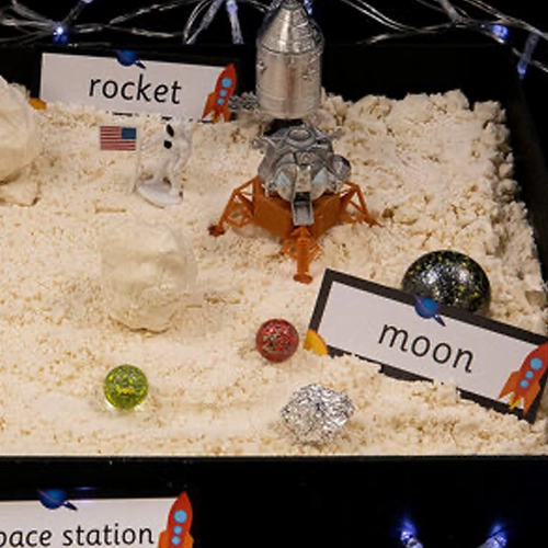 Materials: flour, baby oil, glitter (optional), tray, scoops, toy astronauts