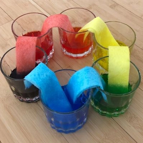 Materials: 6 clear cups, water, paper towels, food coloring (red, yellow, blue)