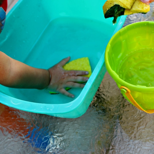 Materials: kitchen sponges, buckets or bowls, water