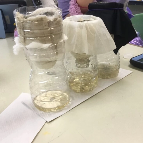 Fill 3 cups with water and add food coloring—red, yellow, and blue. Arrange the cups in a circle, alternating with 3 empty cups. Connect each cup with a folded paper towel strip. Over time, water “walks” through the paper and mixes in the empty cups, forming new colors. This colorful experiment introduces kids to absorption, color blending, and basic water movement—all with zero mess and lots of “wow!”