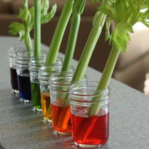 Materials: celery stalks with leaves, clear cups, food coloring, water